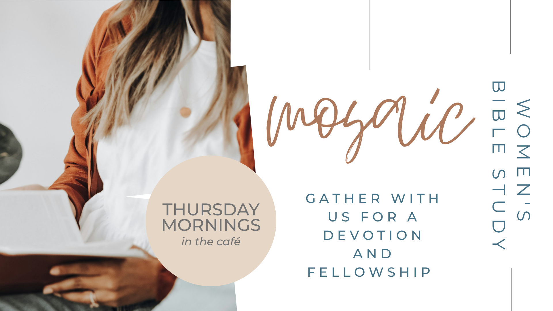 Each week, women of all ages gather on Thursday mornings at 9:30 am, for Mosaic — our Bible study designed to help you know God’s Word and see His hand in your everyday life. Whether you’re new to studying Scripture or have been walking with Jesus for years, you’ll find friendship, encouragement, and space to grow.